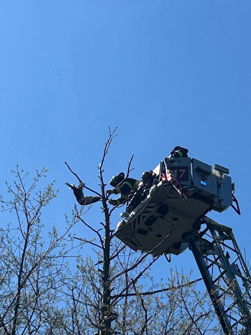Crews were called around 11:30 a.m. after the bird got caught in tangled fishing wire. Firefighters carefully freed the bird and turned it over to Wildlife In Need of Rescue and Rehabilitation.